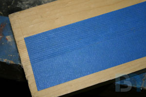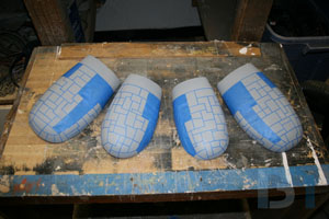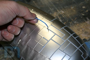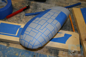 Instead of gluing on a second layer of styrene for the armor details, I thought it would be easier to just mask off the gutters in between and build them up with several coats of paint. So I cut some thin strips of blue tape and laid them down in a random pattern. I sprayed multiple coats of primer and about 3 coats of metallic paint.