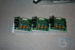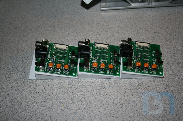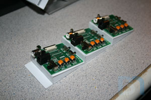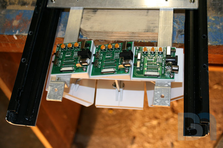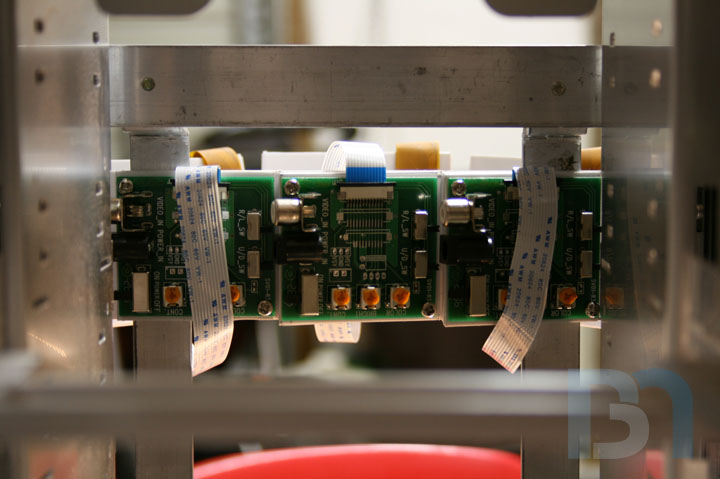 I got the three 2.5" LCD's mounted on the case, along with their controller boards. To hold the controllers, I made this 3-tiered styrene base that will mount behind the screens. This is so the power and composite cables will clear the board next to it. After doing a test fit on the front panel, I had to make a little adjustment to the third tier so it would fit. I drilled and tapped holes in the screen's mounting base, then drilled through the controller base and the front panel frame and screwed it all together from the back.