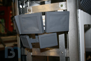 Started on the small dummy screens that will go underneath the three live ones. I cut some pieces from some 1/4" scrap I had, roughed them up a bit, and glued them together. Then I proceeded to make the styrene bezels. Cut the faceplate, and glued the sides on. Then I glued the "screens" in, and drilled the hole for the led. I skinned the back with more styrene, giving it that LCD panel look. I made two pieces for the mounting bracket. One flat aluminum bar to connect both screens and one vertical piece cut from C channel to mount to the rest of the LCD bracketry. I decided to forego the use of any screws to secure the screens to the brackets, opting to just use some styrene rod. After cutting the rod to fit the profile of the screens, I glued them down, holding the bracket in place.