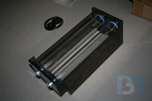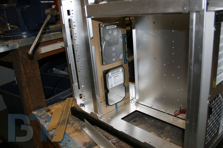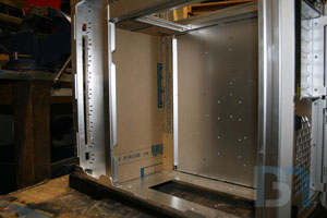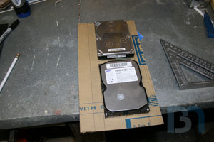 So since I obviously won't be finishing this case by this next weekend (PDXLAN11), I'm still going to bring it up and just throw my system into it as is. I just had to fab up a special hard drive mount for the dual Raptors. I cut some solid black acrylic pieces and fit them into the case. Then I took the largest piece and cut sections out for the drives. I used a couple spare drives as templates. Then I cut two more strips of acrylic, drilled the mouning holes, glued them to the main piece, and added some triangle gussets for strength. Here's a tip: in order to make sure eveything fits the way they're supposed to, screw the pieces onto the drives first, then glue them down. This will ensure the mounting holes will line up to the drives after the glue has dried. I'm building the system tonight, so hopefully I will have another update for you tomorrow, with pics of a fully primed, semi-complete rig!