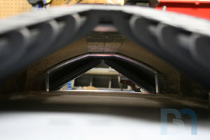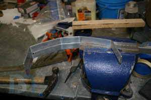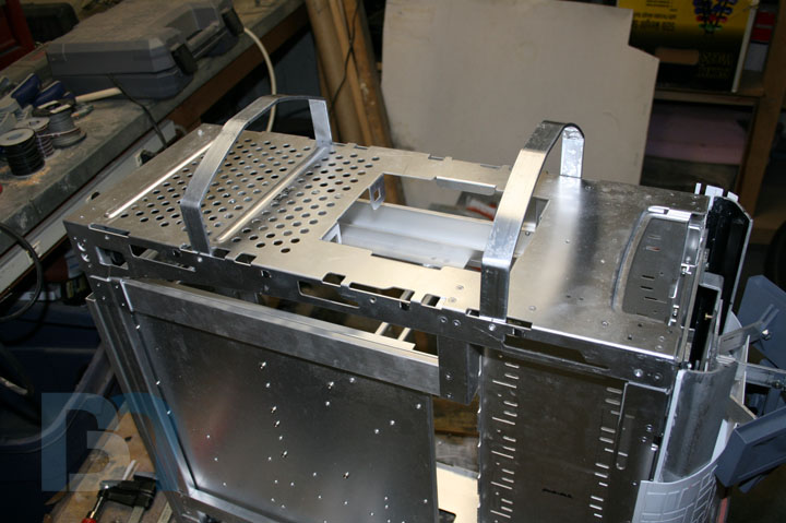 So I took a little break from the side panel detailing to work on the landing bay a bit more. I need to secure it down to the case somehow, so I came up with a simple frame that will bolt to the case, and the landing bay will bolt to that. Here's what I got so far: Bent two pieces of aluminum flat bar so they follow the contour of the landing bay's ceiling. Left enough length at the ends to extend down into the case at the sides. Positioned them so they pick up existing holes in the case frame that are already countersunk. Once I get the roll bars fastened to the case, I can drill holes through the top of the landing bay, then conceal them with some stealthy armor panel covers.