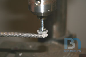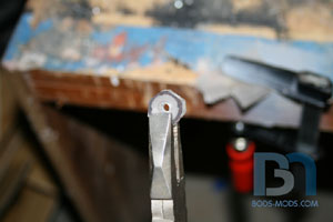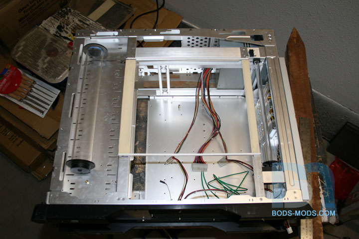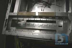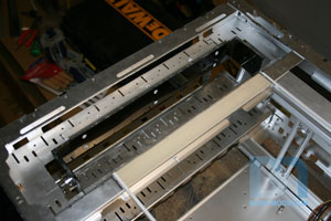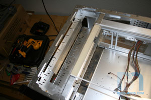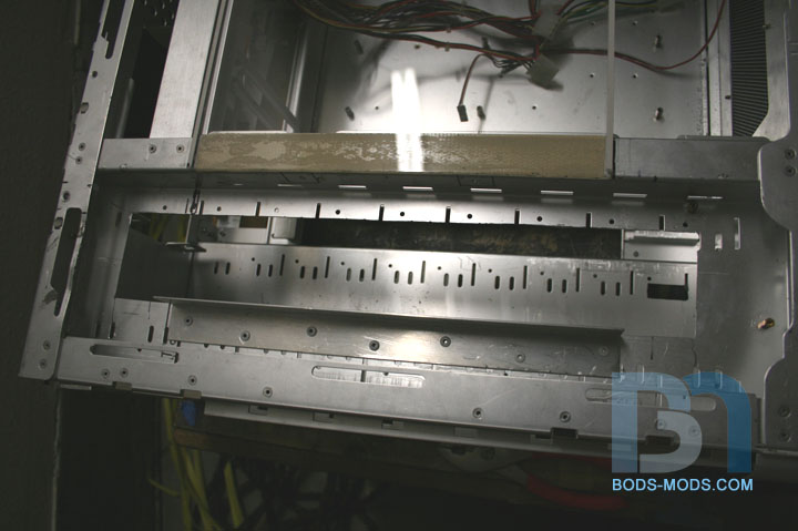 Another alteration is to simplify the path that the door has to take. I had originally intended for the door to travel towards the front, and make a 90° turn into the hard drive cage where the rollers were located. That was adding too much drag, and the door was getting caught up at the turn. So my solution is to hack away part of the hard drive cage and mount the roller closer to the window, thus shortening the path. After cutting away part of the hard drive cage, I took two pieces of aluminum angle bar and sandwiched them together, with the HD cage in the middle. Using pop rivets in a staggered fashion, I fastened them together. This will provide a good solid mount for the cut-down roller holder. Then I pop-riveted the holder into place, utilizing the holes I drilled prior to riveting down the angle pieces. Once I get the second roller in place, I can measure the distance between the two and see how large an o-ring or belt I will need.
