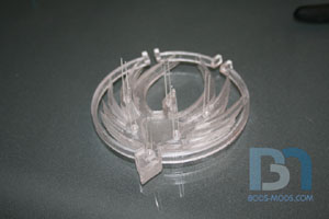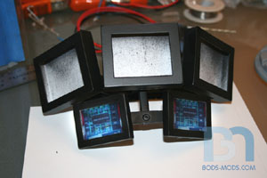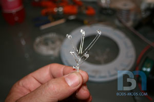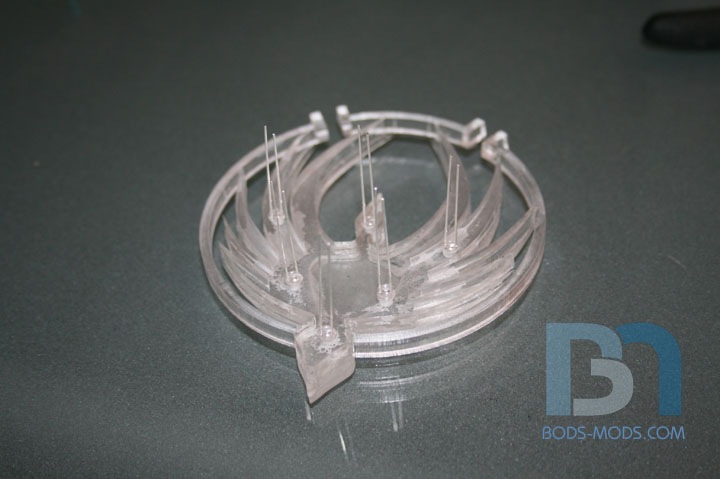 I've been working more on the led strings, and did some testing. I decided to do all six led's in series, with a 10ohm resistor. Since I haven't painted the bird yet, I threw some masking tape over it to give you kind of an idea of how it will look with the backlight. So disregard the faint bleed through! Although it does show you where the leds are.