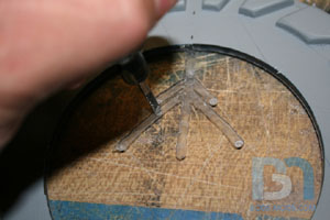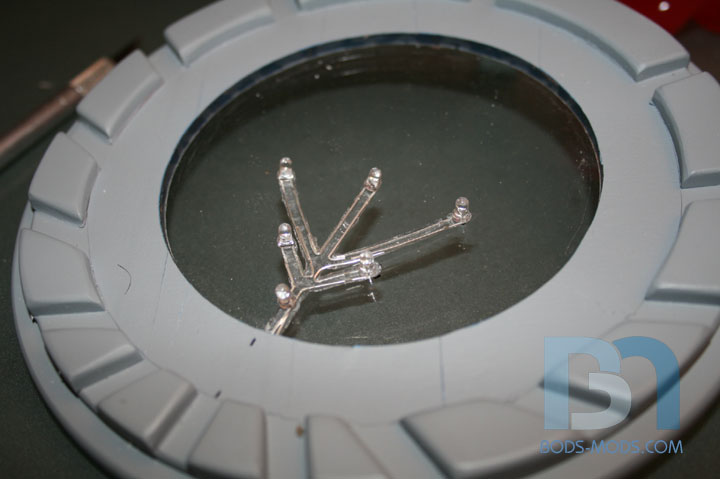 Moving right along, I'm getting things wired up. Starting with some led strings, one for the dummy lcd screens in the cluster, and another for backlighting the medallion. First, I printed some BSG graphics onto transparency paper and cut them out. This particular transparency paper has an adhesive backing. Stuck them onto the screens. These leds will be white. I forgot to take a picture of the leds wired up and in place behind the screens. I will post that and a shot of it all lit up this weekend. For the medallion, I drilled six holes behind the bird to fit the leds. These will be red. Then I soldered them all together in series. For the medallion base, I routed out some material to make room for the wiring. This will all be hidden behind the bird, which will be painted. Here's a shot of the leds placed in the routed area. I drilled a hole through the base at the bottom for the wires to feed through. Once I get it all soldered together and tested, I will use some hot glue to keep everything in place, then sandwich it all together. Then I can paint it!