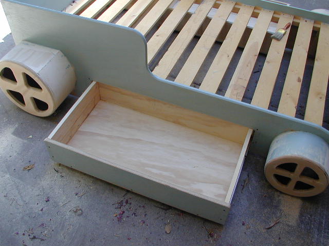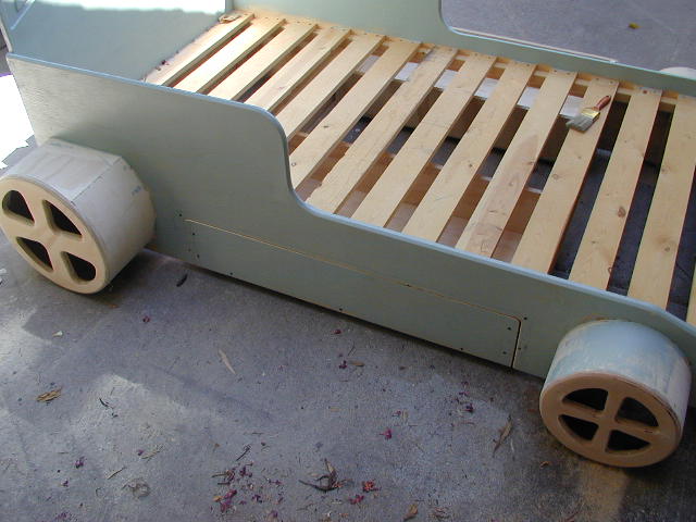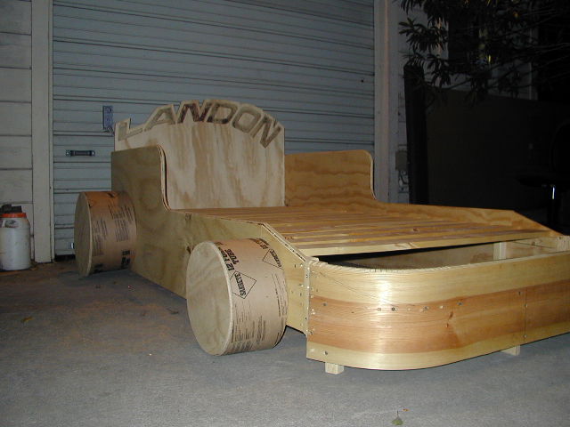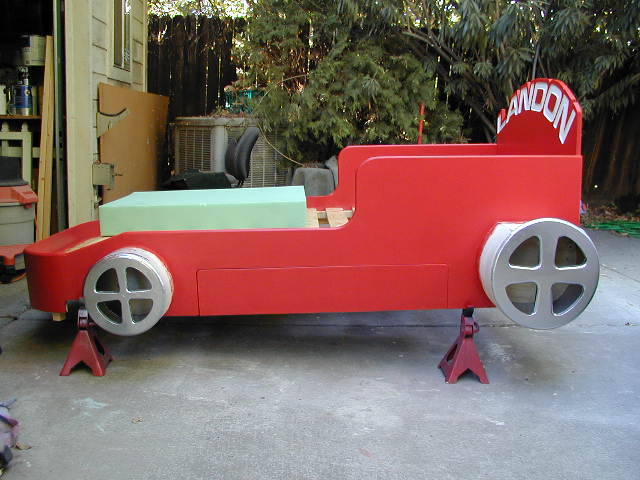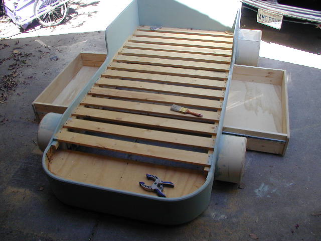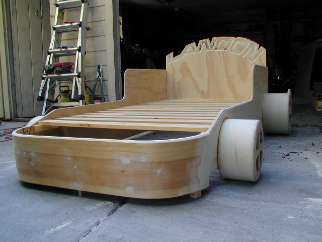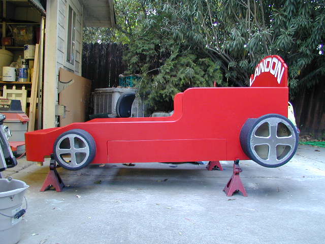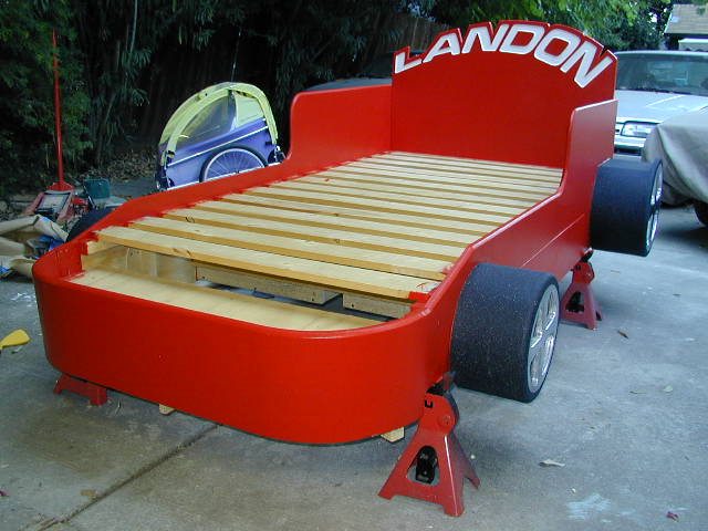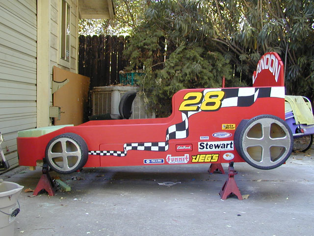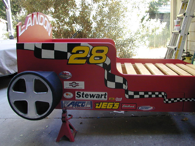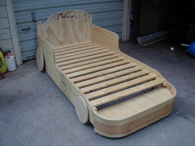 My 3 year-old son was outgrowing his crib, so I thought I would make him a racecar themed bed. I started by looking online for existing designs, but the ones I found were made of plastic, too much money, and would only fit a crib-sized mattress. So I took some plans I found on Lowes.com, and modified the design to accept a twin size mattress.