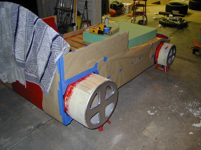 I had plently of automotive product decals from my Javelin project, and they came in handy here! I came up with a checkered flag graphic on the computer, printed out a template, and transferred the design onto the sides of the bedwith an exacto knife. Then, using black, white, and yellow paint, I followed the transferred lines as a guide.