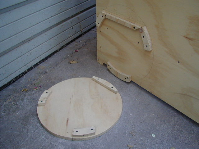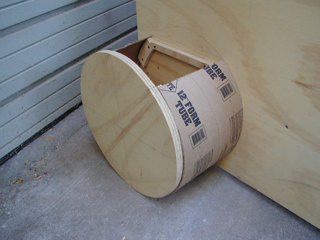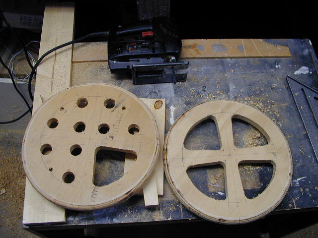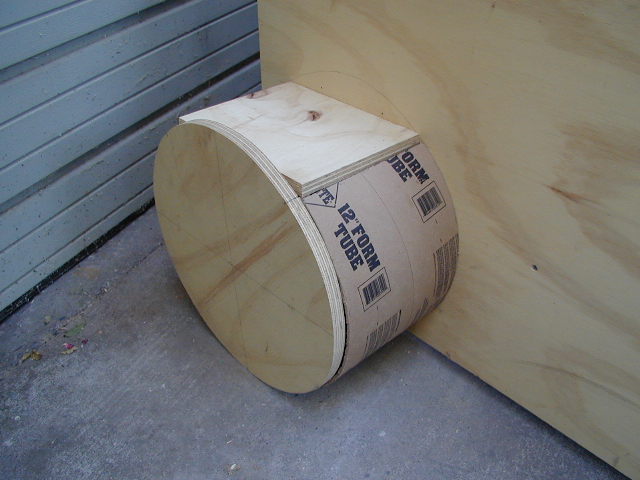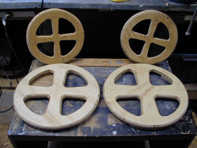 The wheels are made from 3/4" plywood and cardboard tubing.