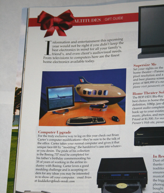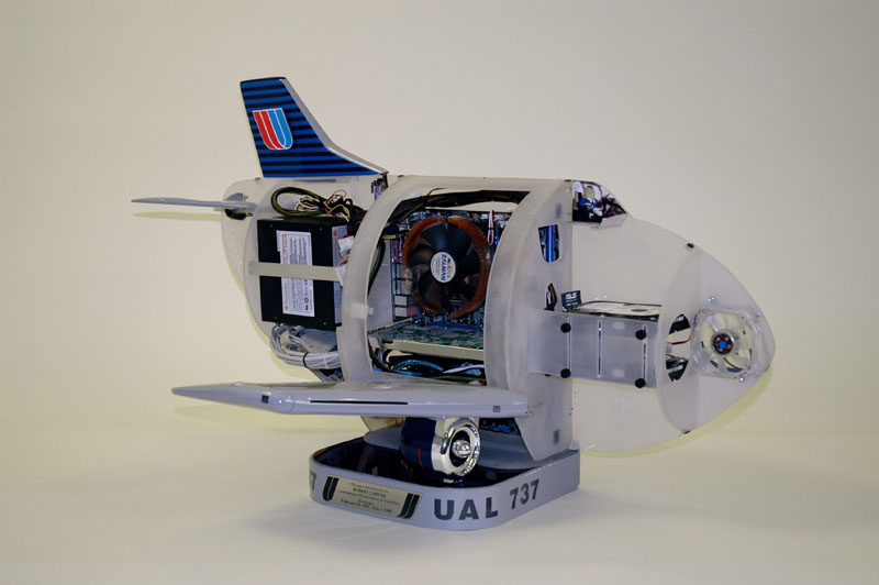 Because of its shape, it wasn't an exact replica of a Boeing 737. But still I wanted to add some realistic detail to it, so I added some navigational lights. I put a landing light on the leading edge of the wing, a light at the tip of the tail facing back, I used the red hdd activity light on top to act as the beacon, and the power LED for the green navigation light on the tip of the right wing. Other lighting includes two 12" blue cathodes to illuminate the inside, one white led for the cockpit, red and blue leds to provide backlighting for the logo on the tail, and two 4" blue cathodes in the base.